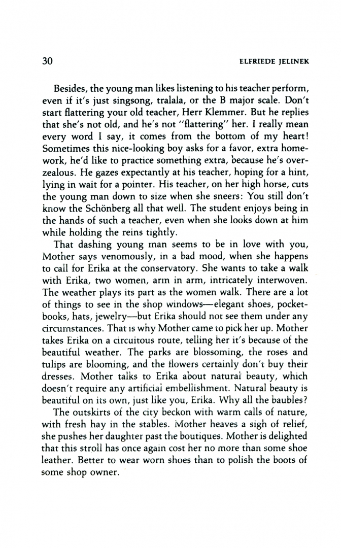 With Walter as her student, Erika spirals out of control, consumed by the ecstasy of self-destruction. A haunting tale of morbid voyeurism and masochism, The Piano Teacher, first published in 1983, is Elfreide Jelinek's Masterpiece.