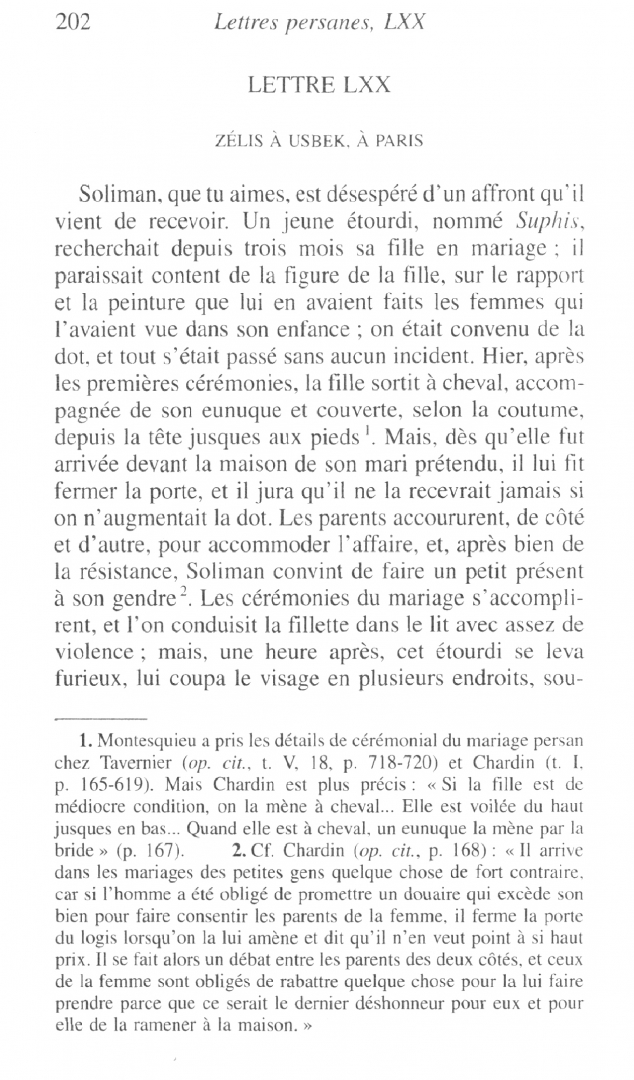 Usbek, un grand seigneur persan intelligent et désabusé, accompagné de son jeune ami Rica, plus malléable et enthousiaste, vient à Paris afin de découvrir les secrets et l'art de vivre du monde occidental. Les moeurs, les caractères, les types sociaux, le décor et la vie - tout les surprend et les pousse au parallèle avec leur propre monde. Puis, une fois surmonté le premier désarroi, cette société nouvelle révèle peu à peu ses fondements et ses lois, mais également ses drames. L'étranger d'abord étonné devient observateur politique, philosophe et quasi-sociologue avant l'heure : « Comment peut-on être persan ? » Si dès leur parution en 1721, les Lettres persanes rencontrent un considérable succès, c'est qu'au-delà du roman par lettres ce livre étrange et neuf est une chronique politique en même temps qu'un journal de voyage. C'est aussi un essai de morale, mais convenons qu'en Montesquieu le moraliste est gai, et que le ton de ses lettres est volontiers narquois. Voltaire, ainsi, a pu juger que, dans cet « ouvrage de plaisanterie », « plein de traits annoncent un esprit plus solide que son livre ». En réalité, le livre est aussi solide que l'esprit car la leçon du roman est que l'impertinence est libératrice : l'écrivain accepte le monde où il vit, mais refuse d'en être la dupe.
