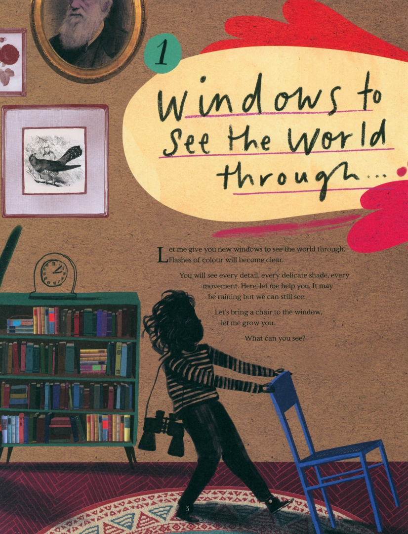 Wild Child: A Journey Through Nature is a beautiful gift book, illustrated in full colour by Barry Falls, and divided into five chapters: looking out of the window, venturing out into the garden, walking in the woods, investigating heathland and wandering on the river bank.