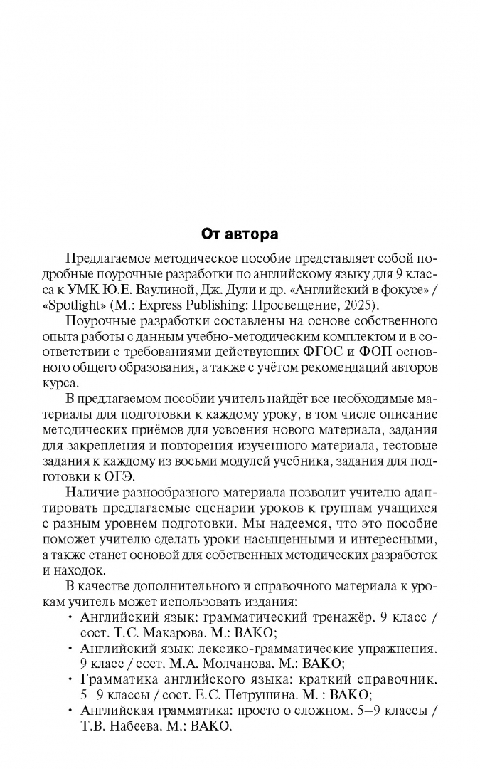 Учитель найдёт в пособии всё необходимое для подготовки к урокам: тематическое планирование учебного материала, подробные сценарии уроков, методические рекомендации по организации работы учащихся, задания на закрепление изученного материала, тесты к каждому модулю учебника, а также планы уроков для подготовки к ОГЭ с дополнительными заданиями, аналогичными по формату заданиям письменной и устной части ОГЭ (в редакции 2025 г.).