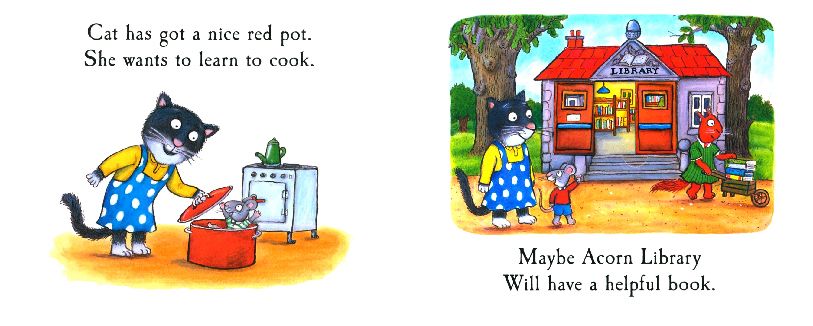 Cat wants to learn to cook. Will she find a book to help her in Acorn Library? Lift the flaps to find out, and then join Cat and all her friends for a special surprise!