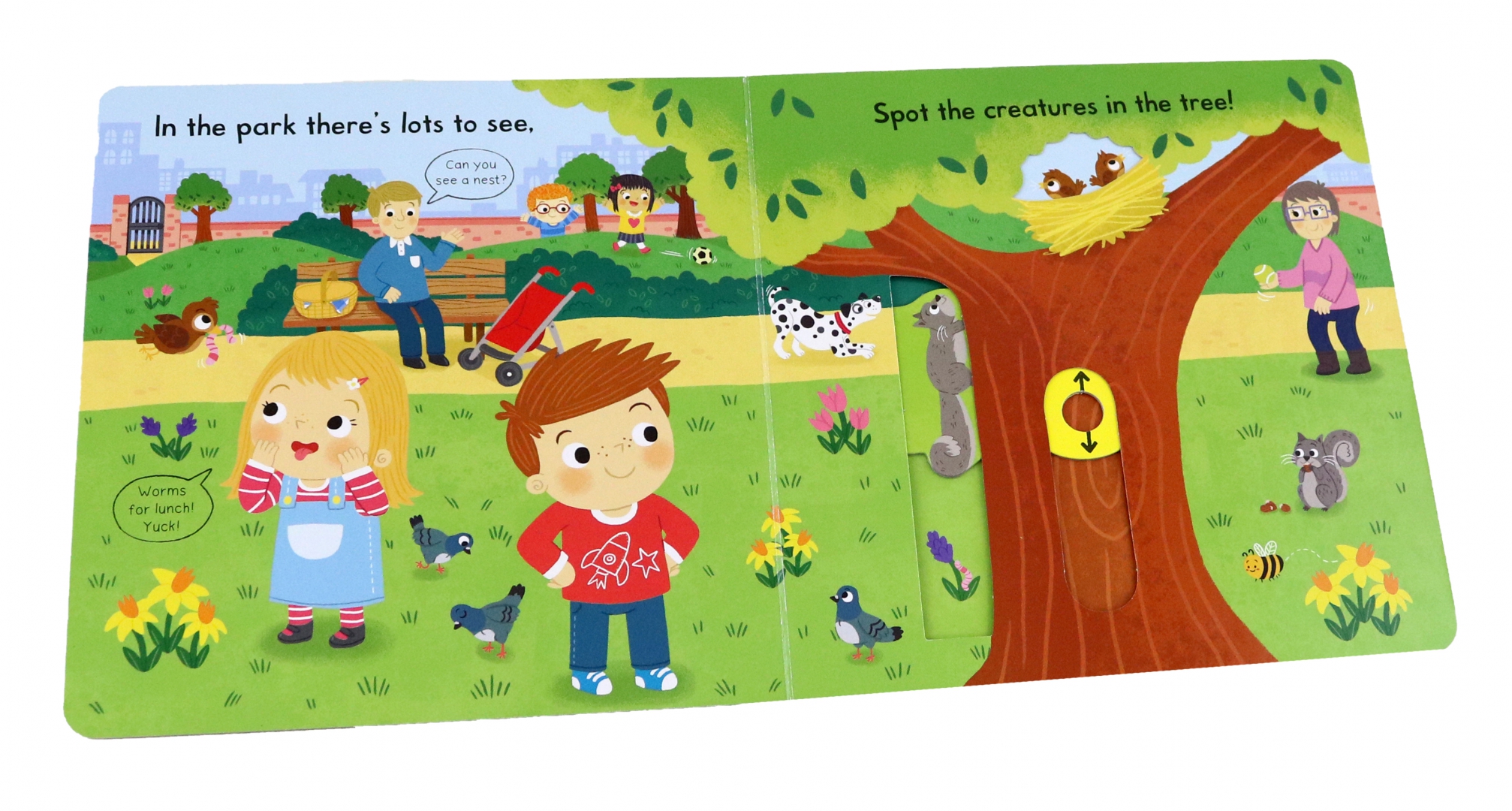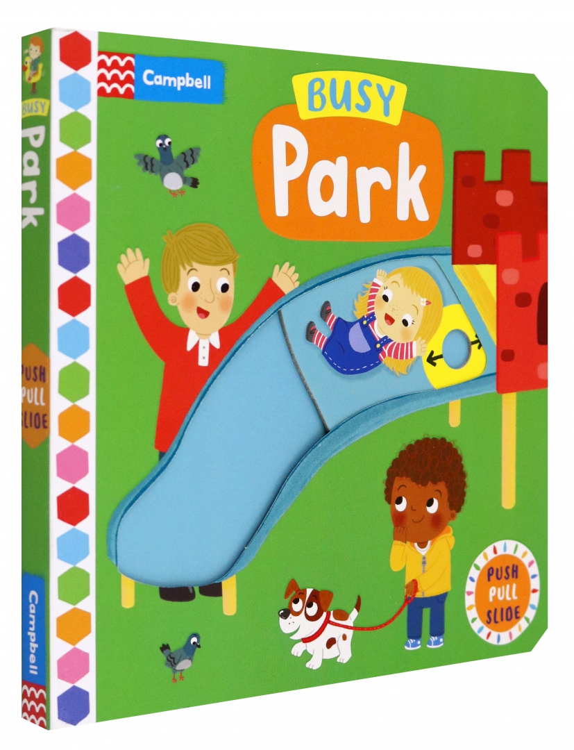 Push, pull and slide the tabs to enjoy a day out at the Busy Park! Visit the playground, spots lots of different animals and have a picnic.