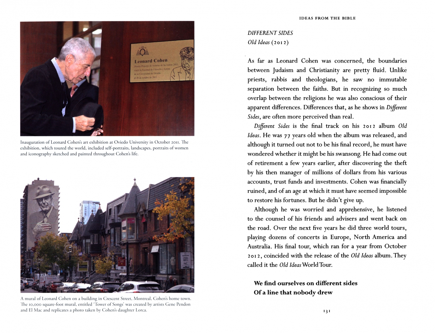Cohen's music is studded with allusions to Jewish and Christian tradition, to stories and ideas drawn from the Bible, Talmud and Kabbalah. From his 1967 classic 'Suzanne', through masterpieces like 'Hallelujah' and 'Who by Fire', to his final challenge to the divinity, 'You Want It Darker' he drew on spirituality for inspiration and as a tool to create understanding, clarity and beauty.