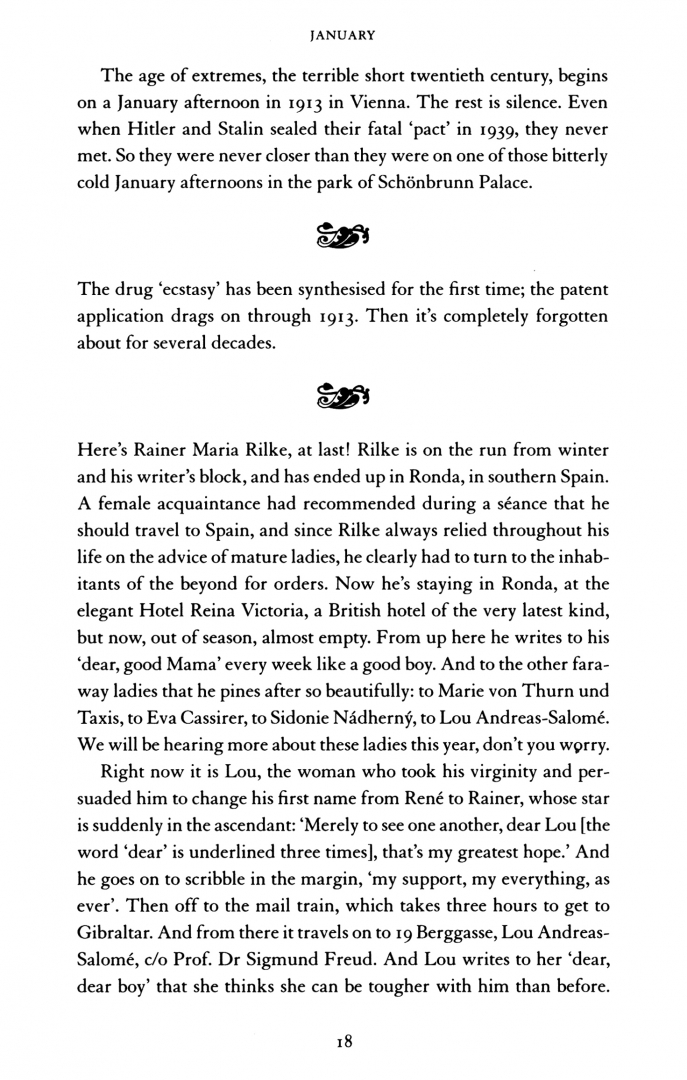 The stuffy conventions of the nineteenth century are receding into the past, and 1913 heralds a new age of unlimited possibility. Kafka falls in love; Louis Armstrong learns to play the trumpet; a young seamstress called Coco Chanel opens her first boutique; Charlie Chaplin signs his first movie contract; and new drugs like cocaine usher in an age of decadence. Yet everywhere there is the premonition of ruin - the number 13 is omnipresent, and in London, Paris and Vienna, artists take the omen and act as if there were no tomorrow. In a Munich hotel lobby, Rilke and Freud discuss beauty and transience; Proust sets out in search of lost time; and while Stravinsky celebrates the Rite of Spring with industrial cacophony, an Austrian postcard painter by the name of Adolf Hitler sells his conventional cityscapes.