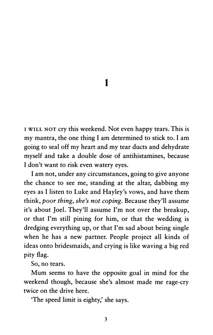 Anna was never going to have an easy time at her best friend's wedding. She's the bridesmaid; her ex, Joel, is a groomsman. But she's determined to get through the weekend with a smile. Despite the fact that Joel is bringing his new girlfriend. Despite the fact that they are all staying in the same house. And despite the fact that at thirty, Anna's life is, objectively, not going to plan. Luckily she has her feelings completely under control – right up until the moment Joel drops a bombshell that changes everything.