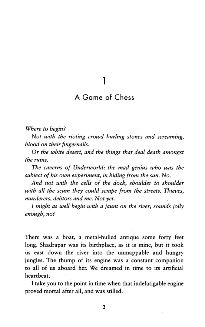 Bearing witness to the desperate struggle for existence between life old and new is Stefan Advani: rebel, outlaw, prisoner, survivor. This is his testament, an account of the journey that took him into the blazing desolation of the western deserts; that transported him east down the river and imprisoned him in the verdant hell of the jungle's darkest heart; that led him deep into the labyrinths and caverns of the underworld. He will meet with monsters, madman, mutants.